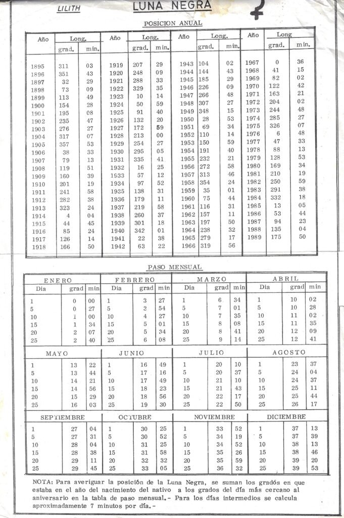 Aún conservo entre mis archivos una vieja efeméride dedicada al cálculo de Lilith que consistía en una sola