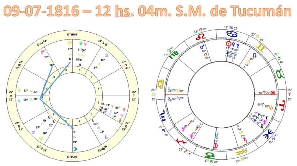 Ambos gráficos representan a la misma Carta Natal, solo que en proyecciones diferentes. El gráfico de la derecha muestra con claridad las posiciones eclípticas de la Carta Natal de la República Argentina. La izquierda muestra la misma carta, pero proyectada priorizando la visión mundana, es decir de las casas astrológicas. Estos aspectos son indiscutibles y todos los astrólogos coinciden en la corrección de su dibujo. Pero ¿qué ocurriría si hacemos abstracción del Zodíaco y tratamos de analizar la carta teniendo en cuenta la afirmación que hicimos anteriormente, de que todas las casas son iguales, y que todas miden exactamente treinta grados sobre el Ecuador. La forma en que se proyecta este gráfico nos ayuda a comprender este concepto, y si nos olvidamos de la existencia de los signos zodiacales y tratamos de medir la distancia de los planetas sobre el sistema de casas, vemos que algunos aspectos eclípticos no tiene correlato mundano, y a la inversa, algunos mundanos no tienen ecliptico.