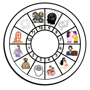 A su vez, la interacción del Horizonte con el Ecuador Celeste da origen al Sistema de Casas Astrológicas. Estas doce casas son la base de los significados «mundanos» de la carta. Lo que la mayoría de los astrólogos dibuja es la superposición de dos ruedas: la zodiacal y la de las casas.